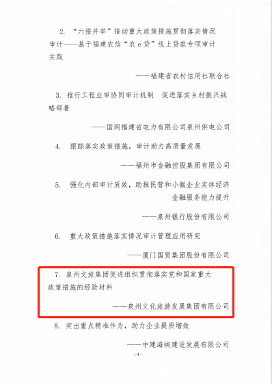 《泉州文旅集團(tuán)促進(jìn)組織貫徹落實(shí)黨和國家重大政策措施的經(jīng)驗(yàn)材料》是泉州文旅集團(tuán)貫徹落實(shí)黨中央、國務(wù)院關(guān)于積極發(fā)展混合所有制經(jīng)濟(jì)決策部署的經(jīng)驗(yàn)總結(jié),是泉州文旅集團(tuán)提高審計(jì)結(jié)果利用、推動研究型審計(jì)的探索實(shí)踐,繼以提高集團(tuán)及權(quán)屬企業(yè)對外投資混合所有制企業(yè)項(xiàng)目建設(shè)和運(yùn)營效率,確保項(xiàng)目可持續(xù)發(fā)展和國有投資風(fēng)險(xiǎn)有效防控。