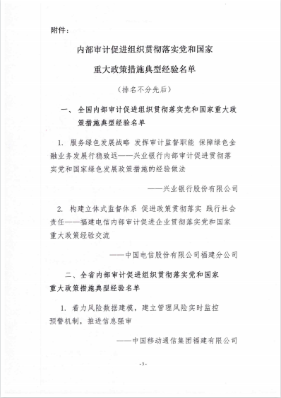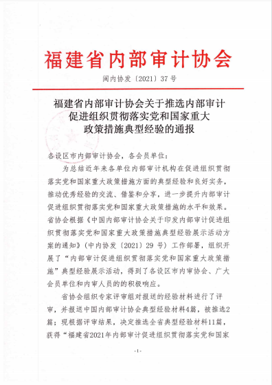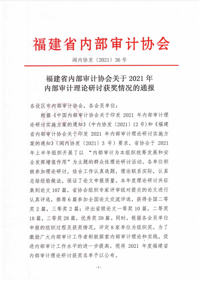 日前,福建省內(nèi)部審計(jì)協(xié)會通報(bào)內(nèi)部審計(jì)促進(jìn)組織貫徹落實(shí)黨和國家重大政策措施典型經(jīng)驗(yàn)名單,以及2021年度內(nèi)部審計(jì)理論研討獲獎情況,由泉州文旅集團(tuán)提交的《泉州文旅集團(tuán)促進(jìn)組織貫徹落實(shí)黨和國家重大政策措施的經(jīng)驗(yàn)材料》被列入全省典型經(jīng)驗(yàn)材料,獲得“福建省2021年內(nèi)部審計(jì)促進(jìn)組織貫徹落實(shí)黨和國家重大政策措施典型經(jīng)驗(yàn)”稱號;由泉州文旅集團(tuán)審計(jì)部撰寫的《淺議如何保障國有小股東在混合所有制企業(yè)中權(quán)益》榮獲全省內(nèi)部審計(jì)理論研討三等獎。