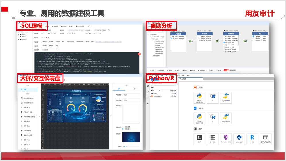 大數(shù)據(jù)時代,如何能將審計工作從“經(jīng)驗驅(qū)動”變?yōu)椤皵?shù)據(jù)驅(qū)動”,周建婕表示數(shù)據(jù)分析系統(tǒng)是為企業(yè)、行政事業(yè)單位的內(nèi)部審計人員及領(lǐng)導(dǎo)提供的一款集數(shù)據(jù)采集、數(shù)據(jù)建模、數(shù)據(jù)分析及指標(biāo)監(jiān)控預(yù)警于一體的數(shù)據(jù)審計產(chǎn)品。系統(tǒng)支持離線與在線數(shù)據(jù)采集,實現(xiàn)業(yè)財數(shù)據(jù)關(guān)聯(lián)與集中管理;系統(tǒng)提供拖拽點選式建模工具,方便審計業(yè)務(wù)人員自助分析;系統(tǒng)也提供SQL建模工具,可以利用SQL創(chuàng)建分析模型,系統(tǒng)內(nèi)置10余項查詢分析功能及覆蓋預(yù)算、資金、資產(chǎn)、往來、收支等100余個分析模型,實現(xiàn)審計經(jīng)驗的沉淀;另外,系統(tǒng)提供大屏/交互儀表盤,創(chuàng)建各類炫酷的大屏效果,方便決策分析。系統(tǒng)支持創(chuàng)建預(yù)警指標(biāo)及模型,自動將查詢出的數(shù)據(jù)推送給審計人員,便于直接關(guān)注風(fēng)險疑點,確定審計重點,提供審計效率,提高審計工作質(zhì)量;系統(tǒng)支持生成風(fēng)險監(jiān)控報告,對各個單位的風(fēng)險問題進行集中反映,方便領(lǐng)導(dǎo)監(jiān)督和決策。